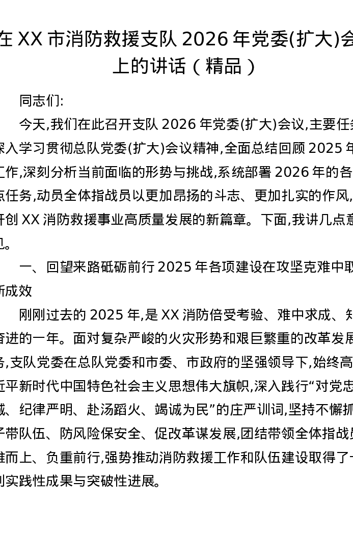 在XX市消防救援支队2026年党委(扩大)会议上的讲话(精品)