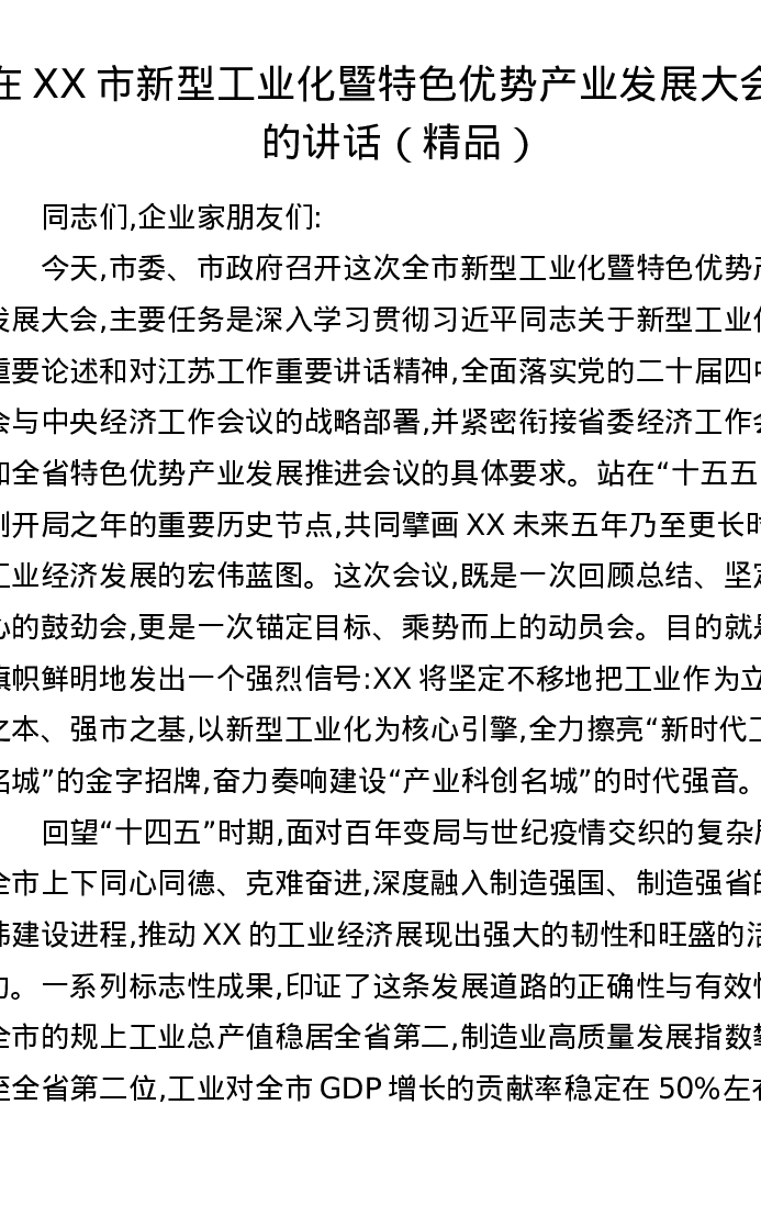 在XX市新型工业化暨特色优势产业发展大会上的讲话