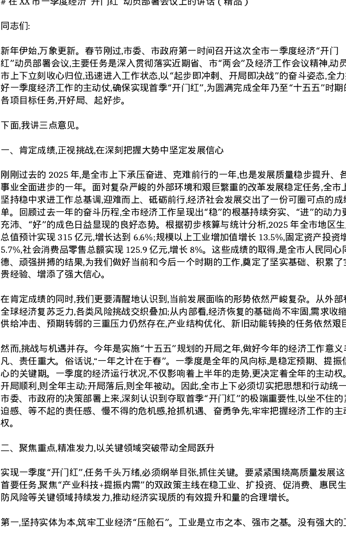 在XX市一季度经济开门红动员部署会议上的讲话