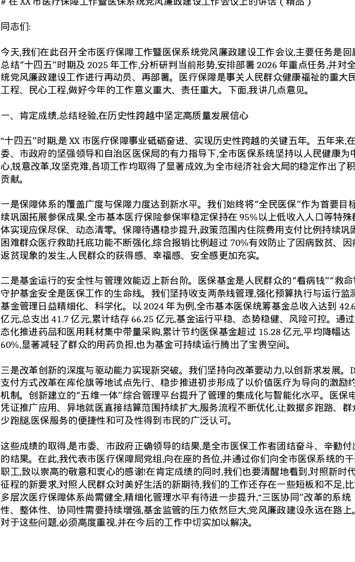 在XX市医疗保障工作暨医保系统党风廉政建设工作会议上的讲话