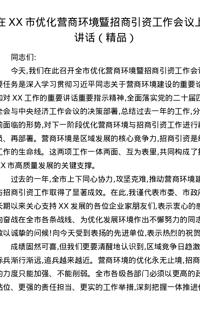 在XX市优化营商环境暨招商引资工作会议上的讲话