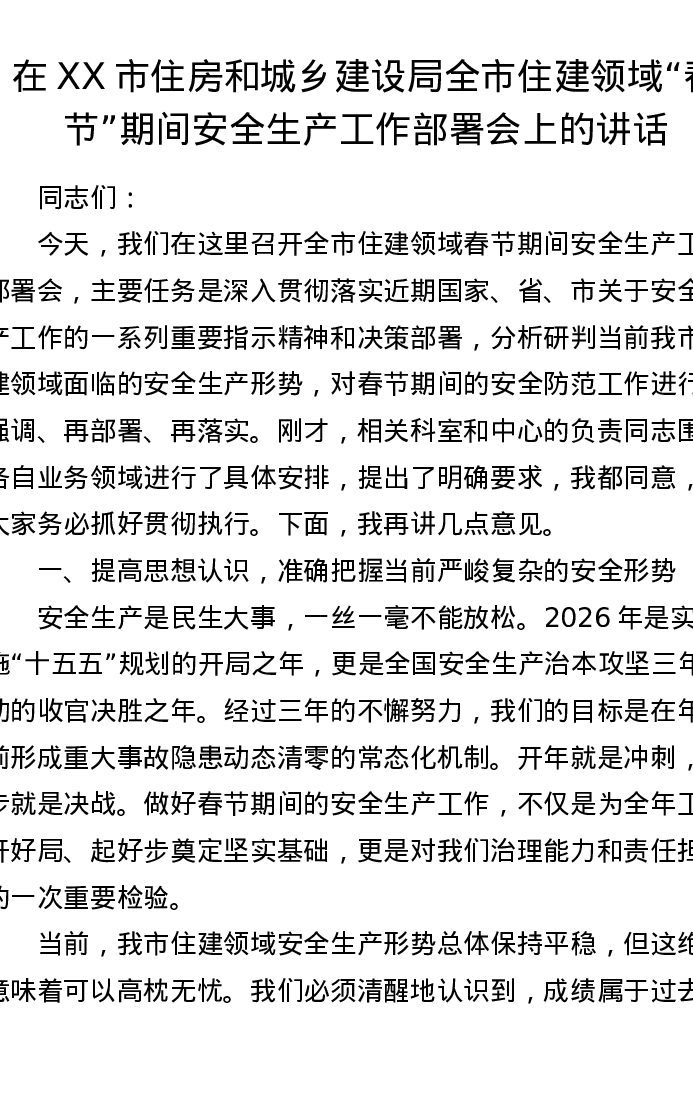 在XX市住房和城乡建设局全市住建领域春节期间安全生产工作部署会上的讲话
