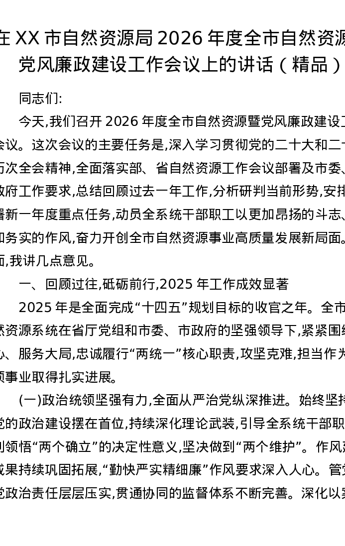 在XX市自然资源局2026年度全市自然资源暨党风廉政建设工作会议上的讲话(精品)