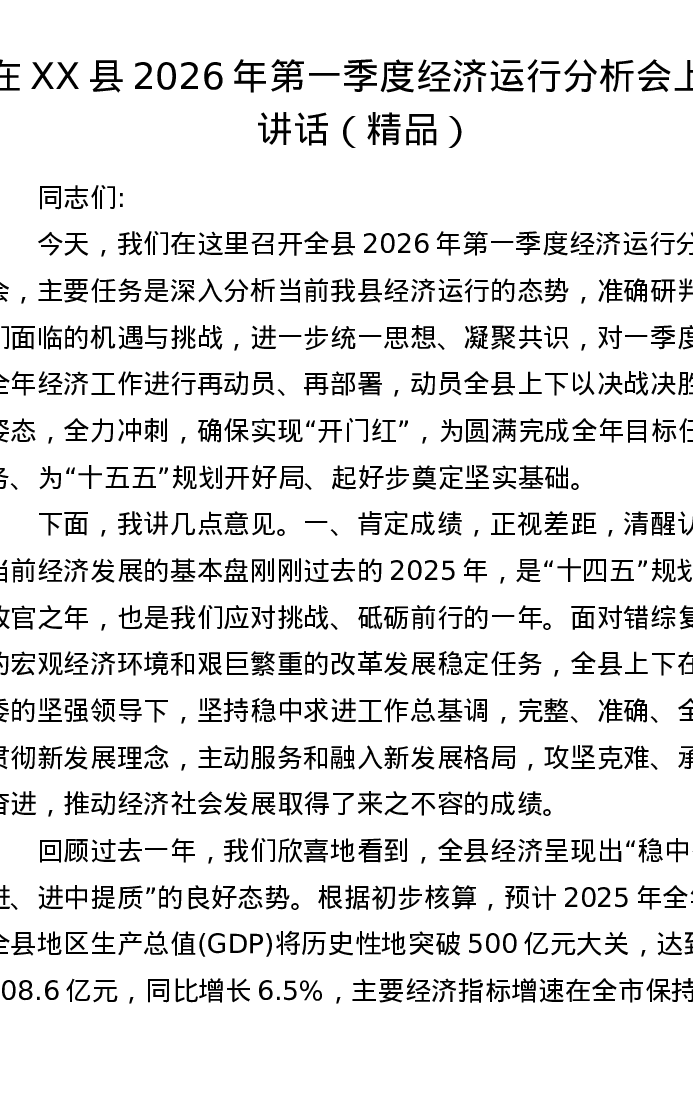 在XX县2026年第一季度经济运行分析会上的讲话(精品)