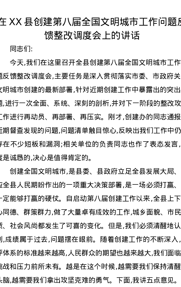在XX县创建第八届全国文明城市工作问题反馈整改调度会上的讲话