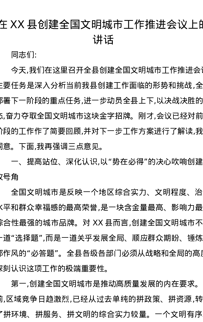 在XX县创建全国文明城市工作推进会议上的讲话2