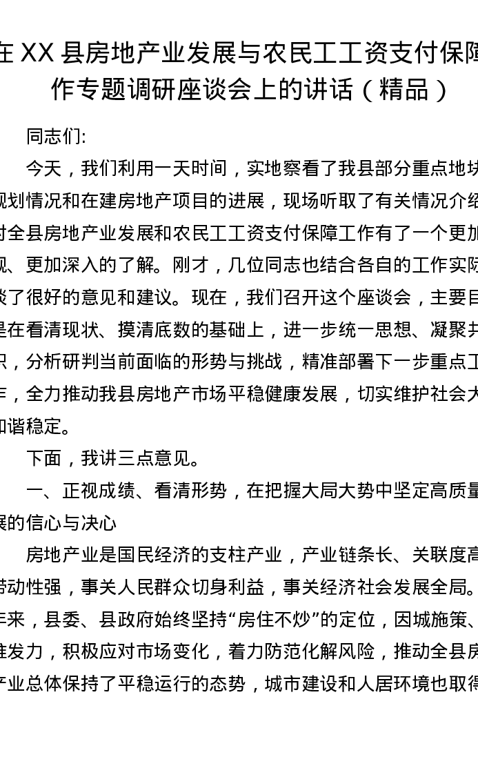 在XX县房地产业发展与农民工工资支付保障工作专题调研座谈会上的讲话(精品)