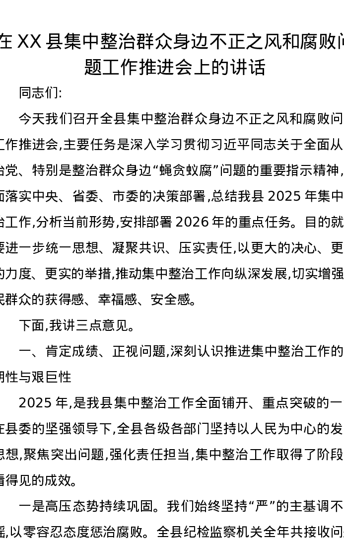 在XX县集中整治群众身边不正之风和腐败问题工作推进会上的讲话