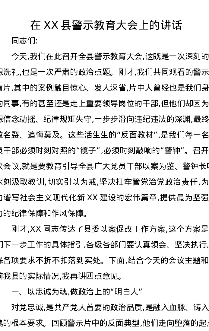 在XX县警示教育大会上的讲话