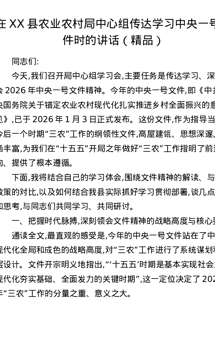在XX县农业农村局中心组传达学习中央一号文件时的讲话