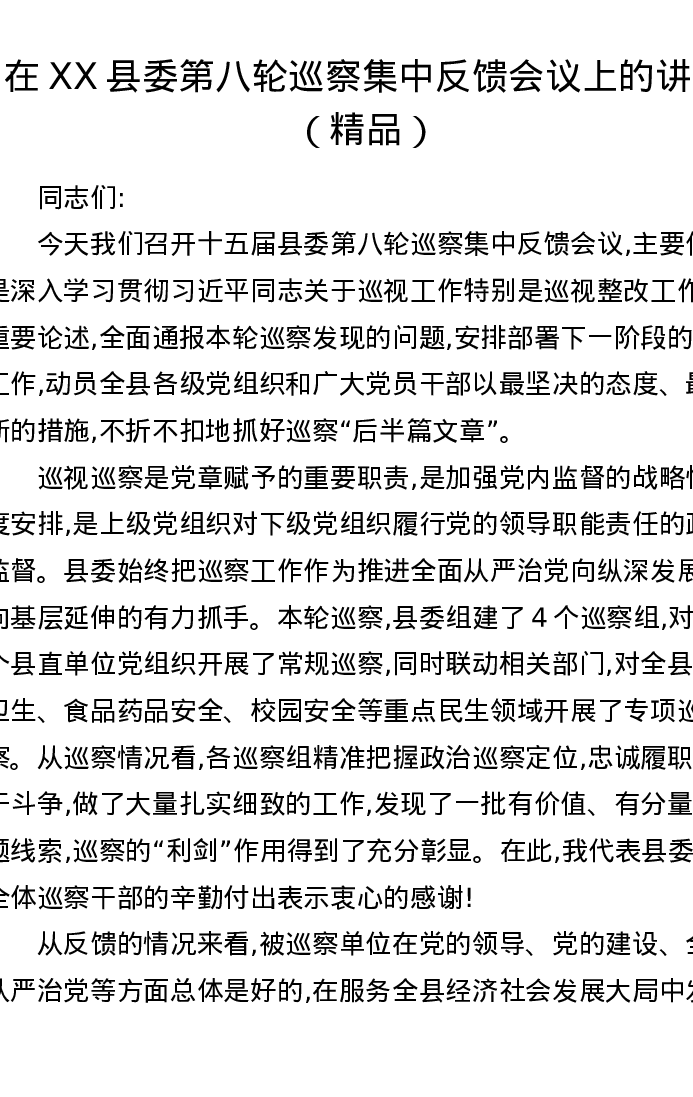 在XX县委第八轮巡察集中反馈会议上的讲话