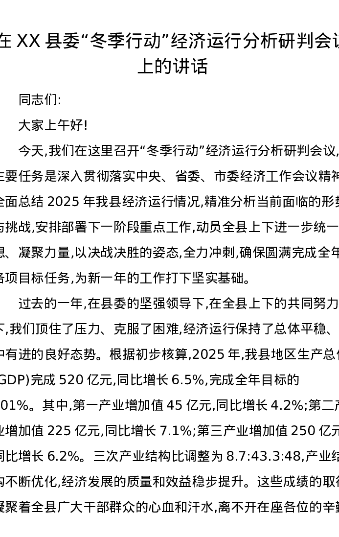 在XX县委冬季行动经济运行分析研判会议上的讲话