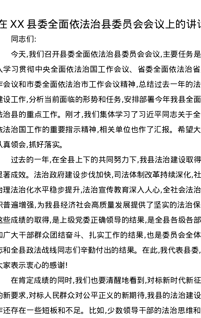 在XX县委全面依法治县委员会会议上的讲话(3)