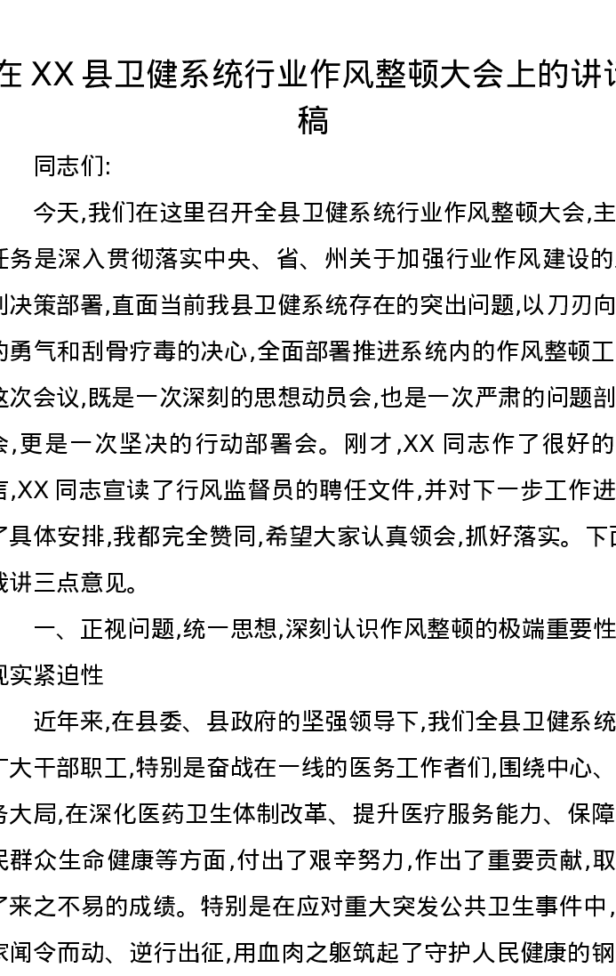 在XX县卫健系统行业作风整顿大会上的讲话稿