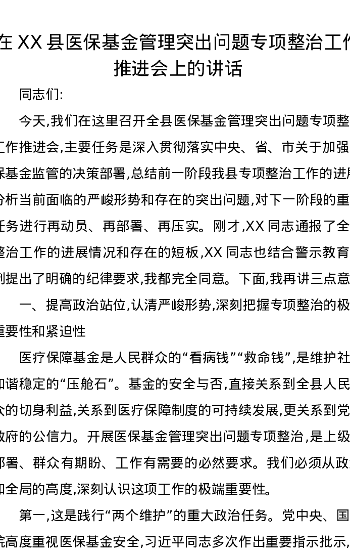 在XX县医保基金管理突出问题专项整治工作推进会上的讲话