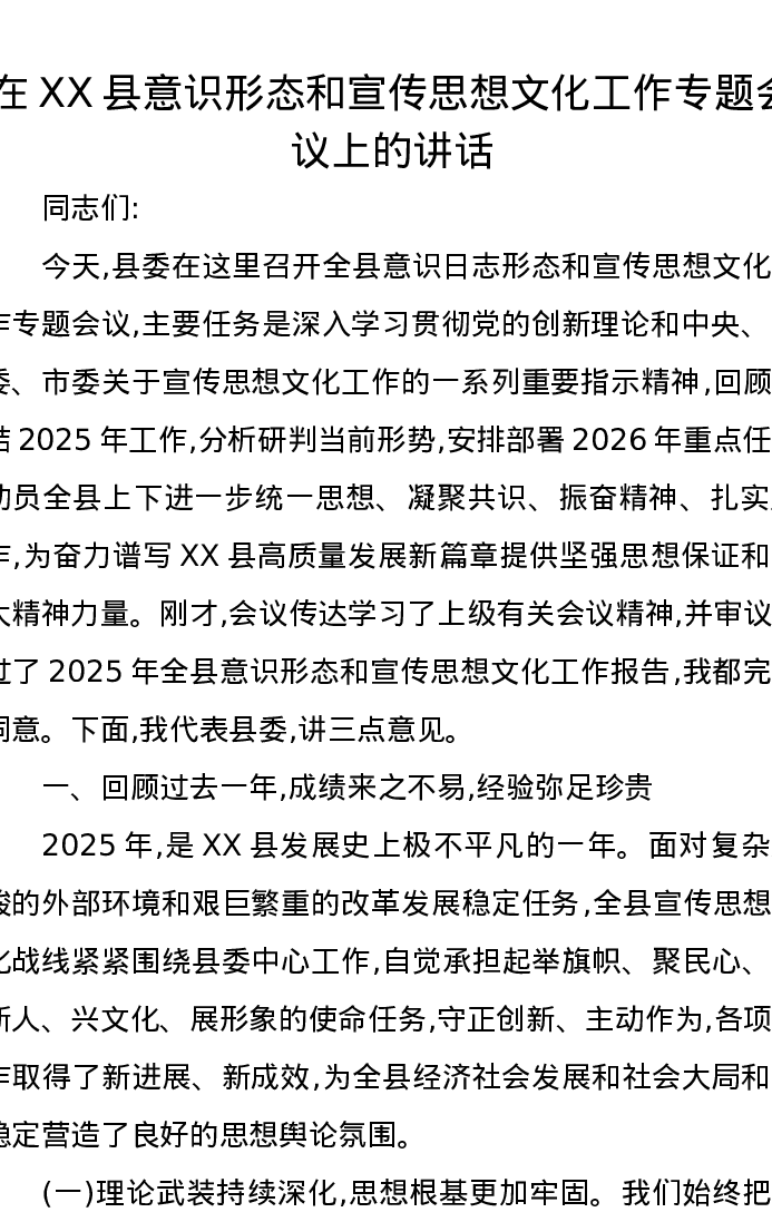 在XX县意识形态和宣传思想文化工作专题会议上的讲话
