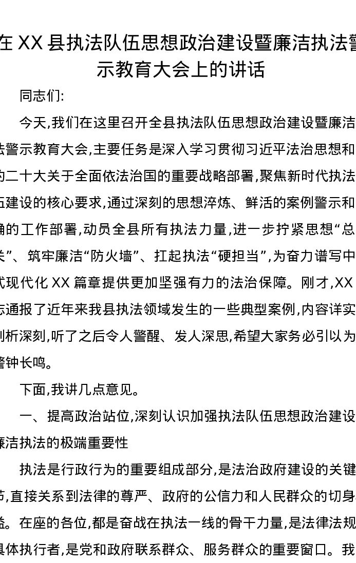 在XX县执法队伍思想政治建设暨廉洁执法警示教育大会上的讲话