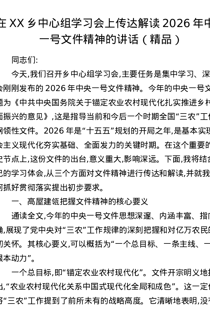 在XX乡中心组学习会上传达解读2026年中央一号文件精神的讲话
