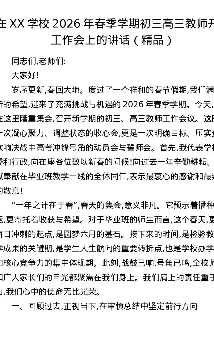 在XX学校2026年春季学期初三高三教师开学工作会上的讲话
