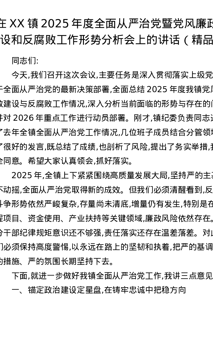 在XX镇2025年度全面从严治党暨党风廉政建设和反腐败工作形势分析会上的讲话
