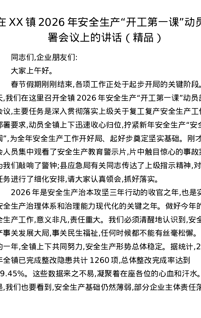 在XX镇2026年安全生产开工第一课动员部署会议上的讲话