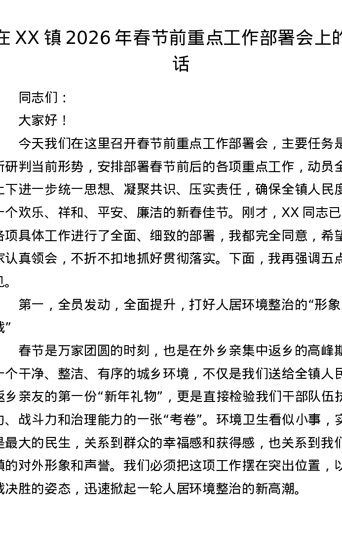 在XX镇2026年春节前重点工作部署会上的讲话