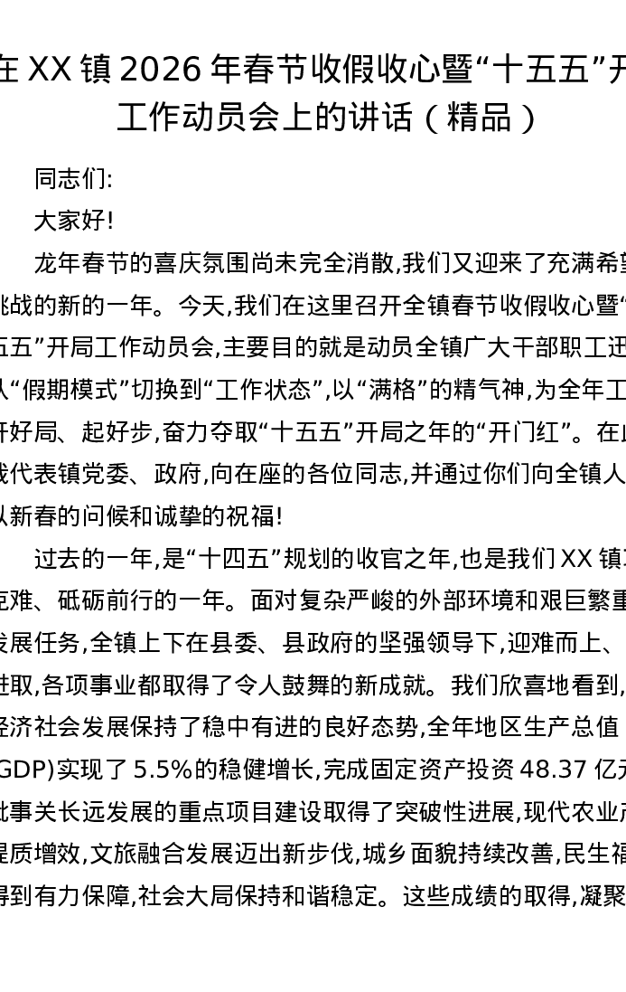 在XX镇2026年春节收假收心暨十五五开局工作动员会上的讲话