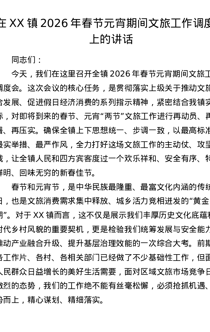 在XX镇2026年春节元宵期间文旅工作调度会上的讲话