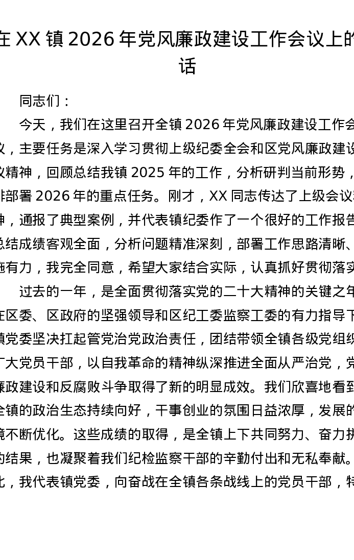 在XX镇2026年党风廉政建设工作会议上的讲话