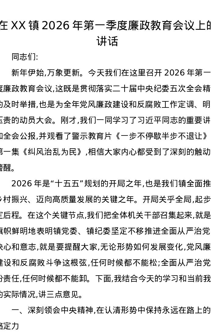 在XX镇2026年第一季度廉政教育会议上的讲话