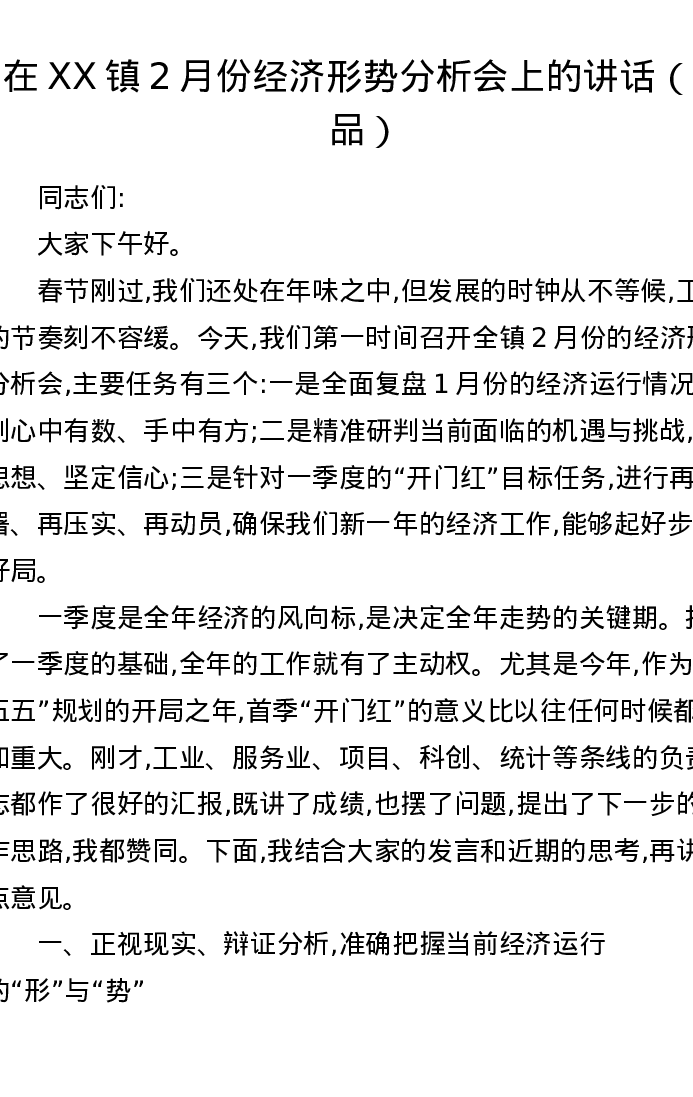在XX镇2月份经济形势分析会上的讲话