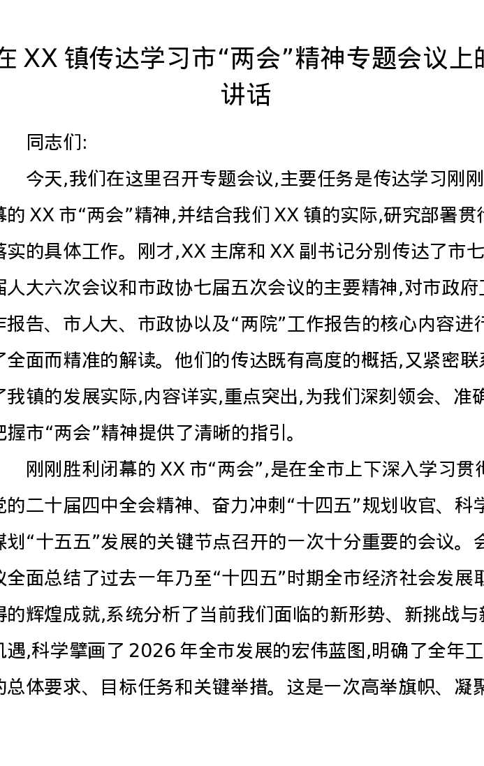 在XX镇传达学习市两会精神专题会议上的讲话