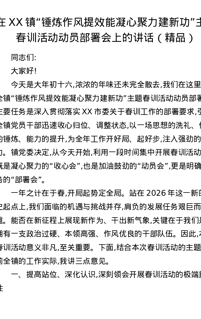 在XX镇锤炼作风提效能凝心聚力建新功主题春训活动动员部署会上的讲话