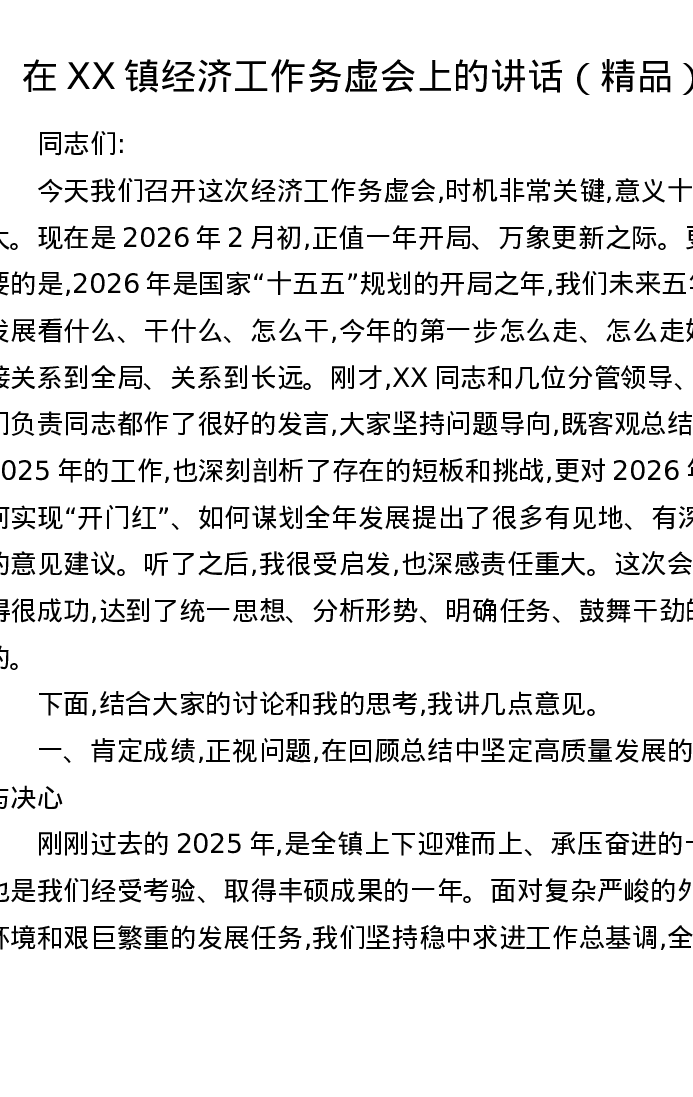 在XX镇经济工作务虚会上的讲话