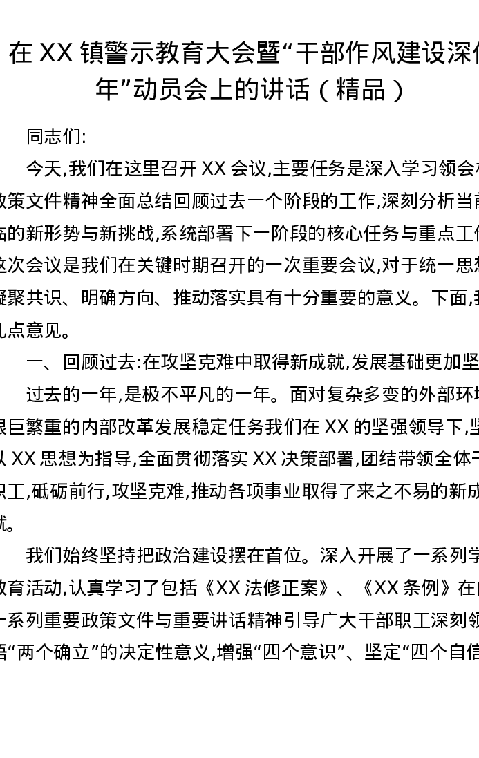 在XX镇警示教育大会暨干部作风建设深化年动员会上的讲话