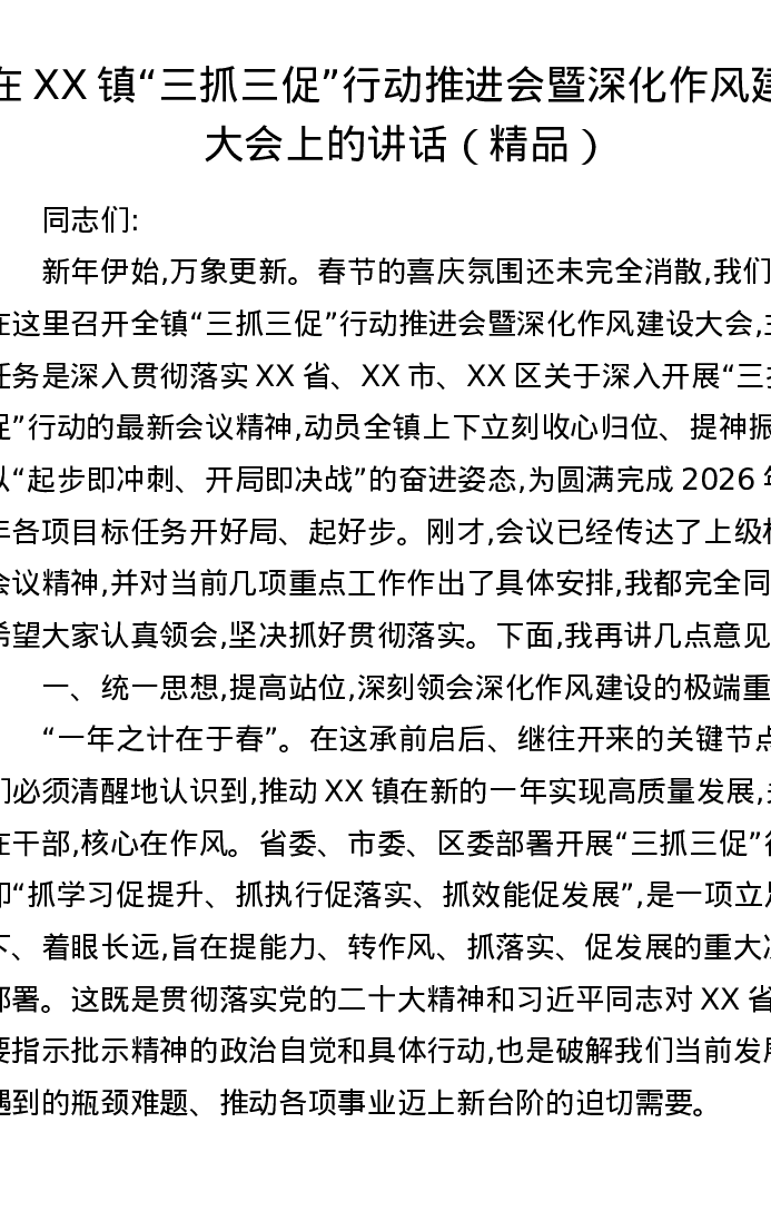 在XX镇三抓三促行动推进会暨深化作风建设大会上的讲话