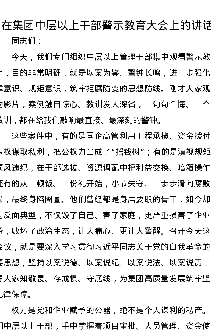 在集团中层以上干部警示教育大会上的讲话