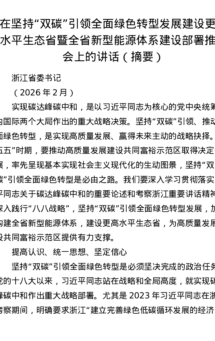 在坚持双碳引领 全面绿色转型发展 建设更高水平生态省暨全省新型能源体系建设部署推进会上的讲话(摘要)