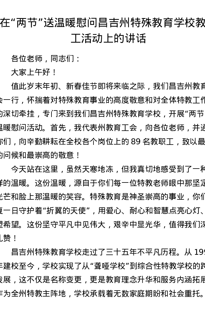 在两节送温暖慰问昌吉州特殊教育学校教职工活动上的讲话