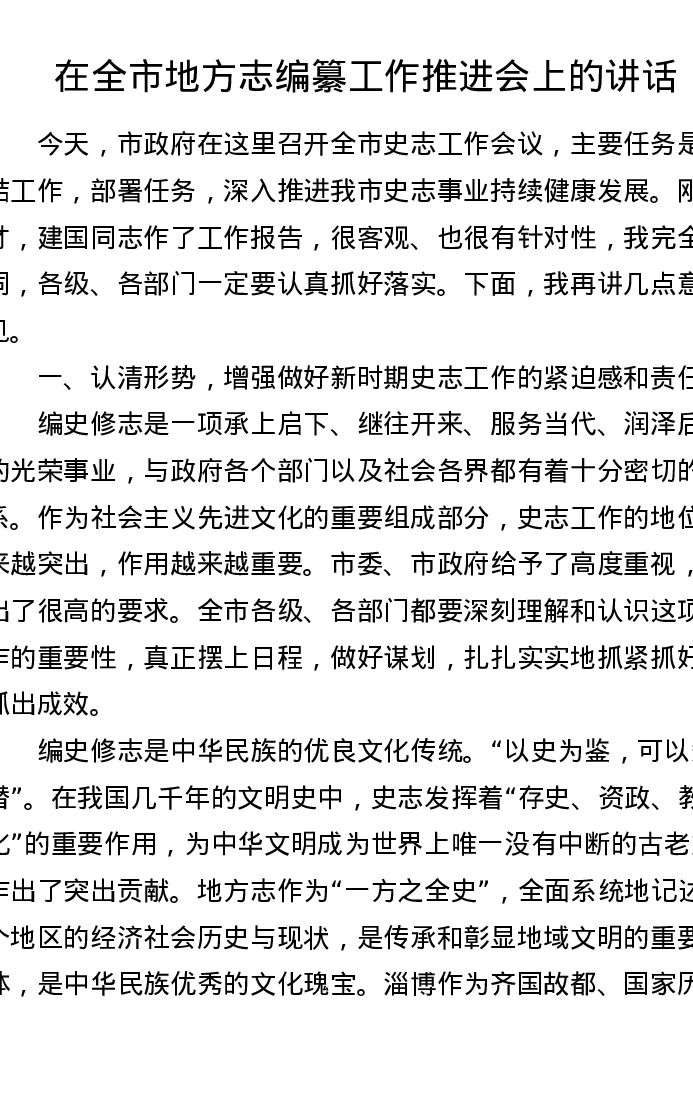 在全市地方志编纂工作推进会上的讲话