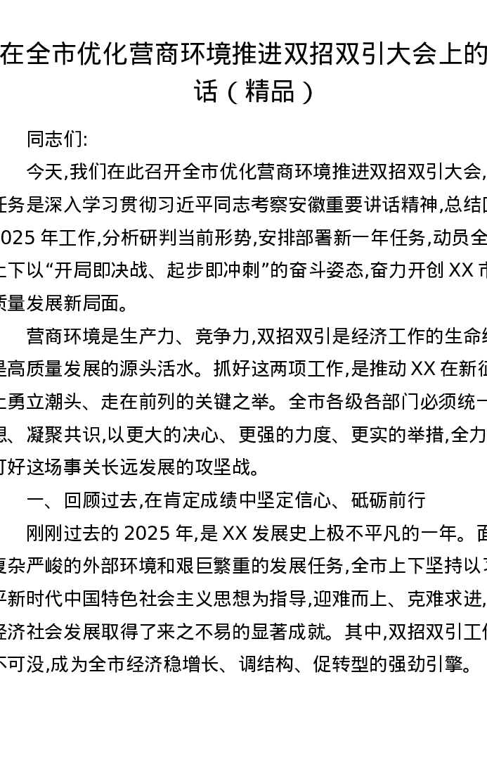 在全市优化营商环境推进双招双引大会上的讲话