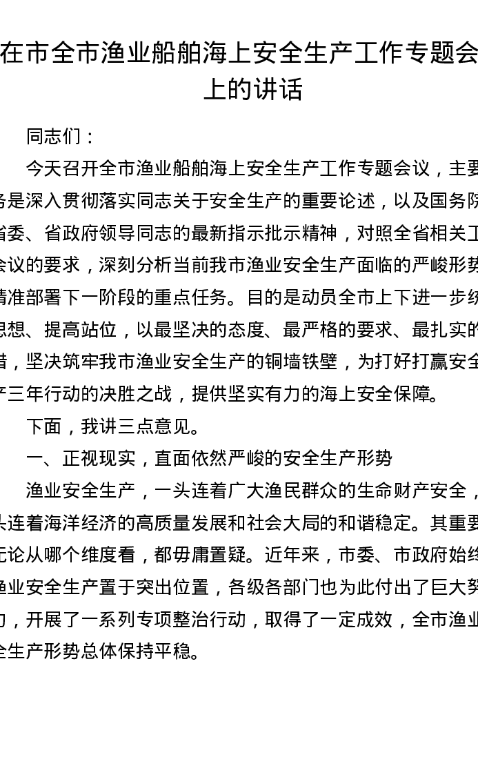 在市全市渔业船舶海上安全生产工作专题会议上的讲话
