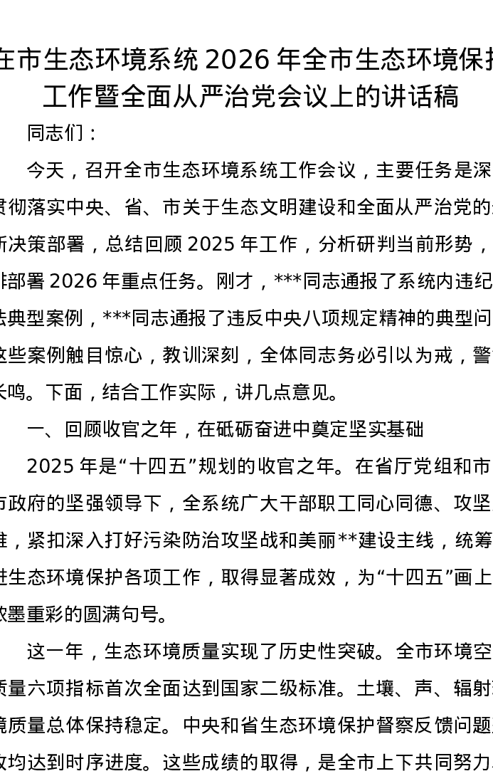在市生态环境系统2026年全市生态环境保护工作暨全面从严治党会议上的讲话稿