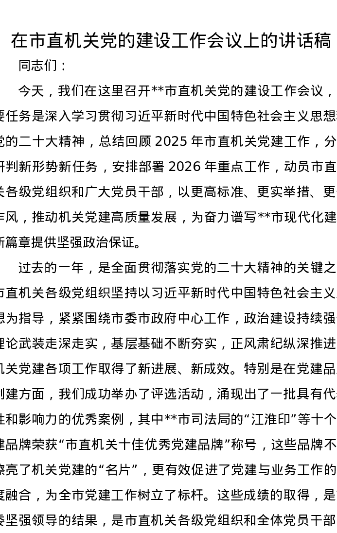 在市直机关党的建设工作会议上的讲话稿