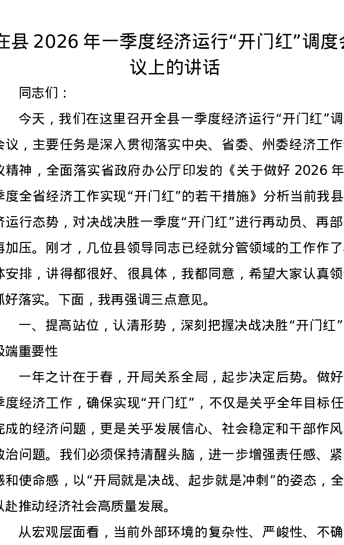 在县2026年一季度经济运行开门红调度会议上的讲话