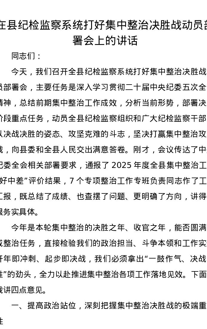 在县纪检监察系统打好集中整治决胜战动员部署会上的讲话