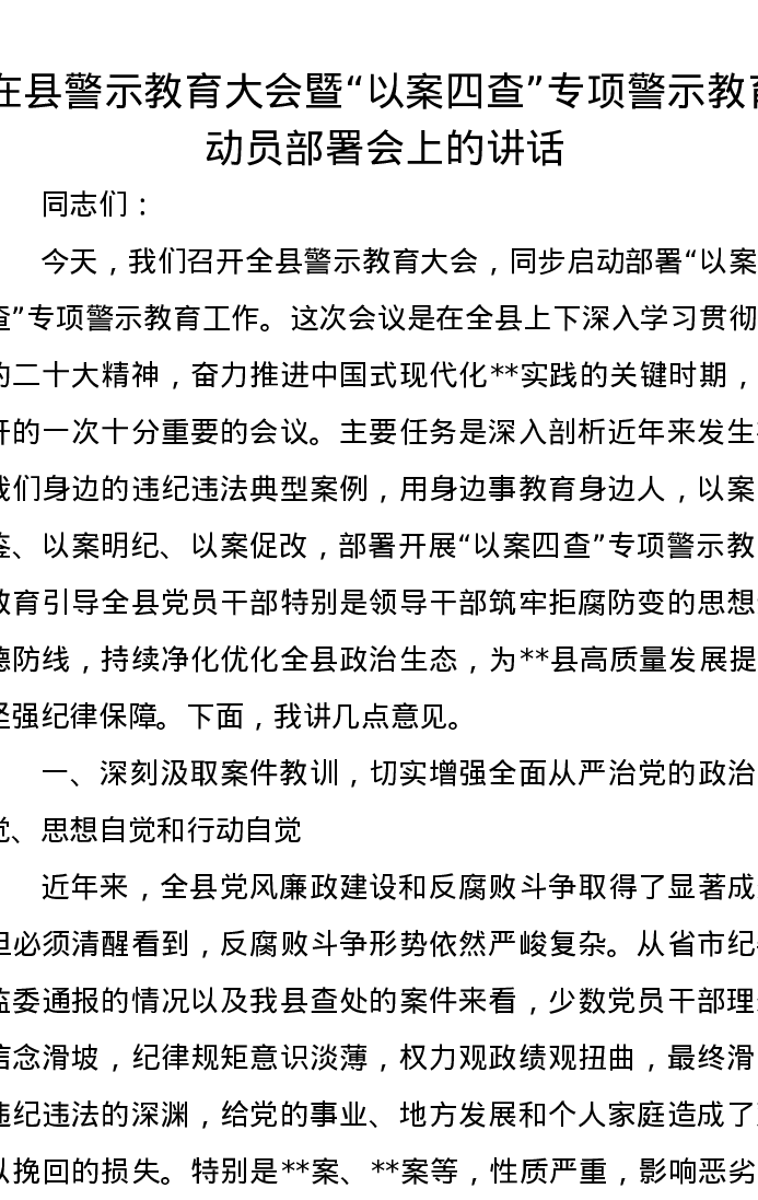 在县警示教育大会暨以案四查专项警示教育动员部署会上的讲话