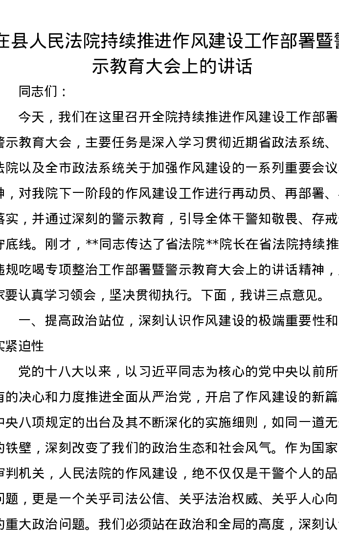 在县人民法院持续推进作风建设工作部署暨警示教育大会上的讲话