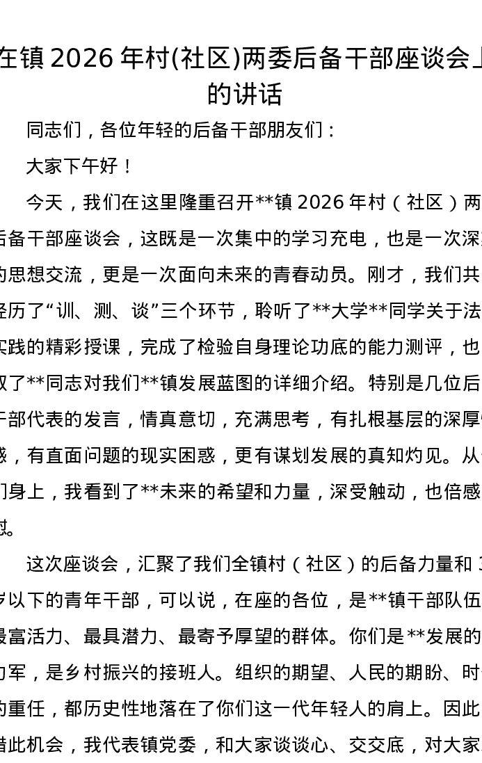 在镇2026年村(社区)两委后备干部座谈会上的讲话
