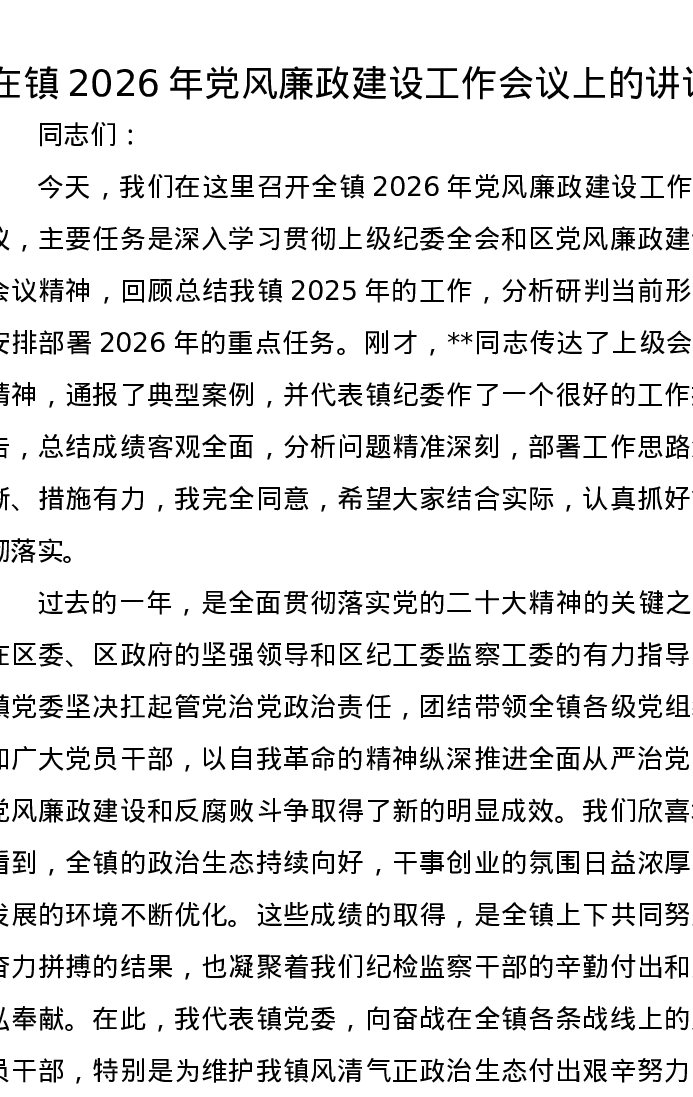 在镇2026年党风廉政建设工作会议上的讲话